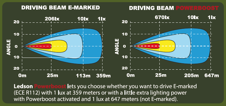 Kuorma kaukovalon tehostustilassa: 10,6A @ 12V ja 4,8A @ 24V (vain kaukovalo, ei sijaintivaloa)