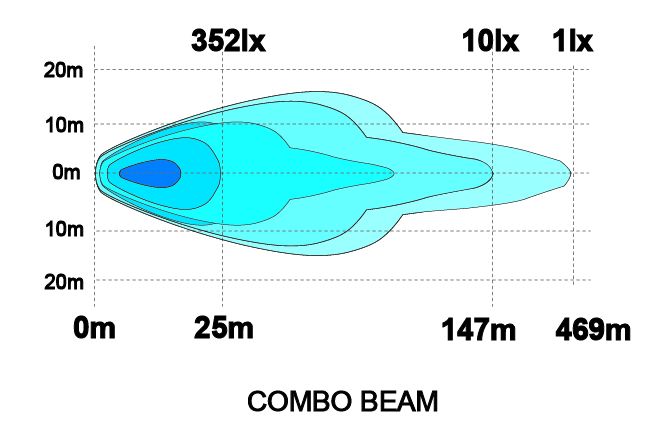 Kantama: 938 m (0,25 lux), 469 m (1 lux)